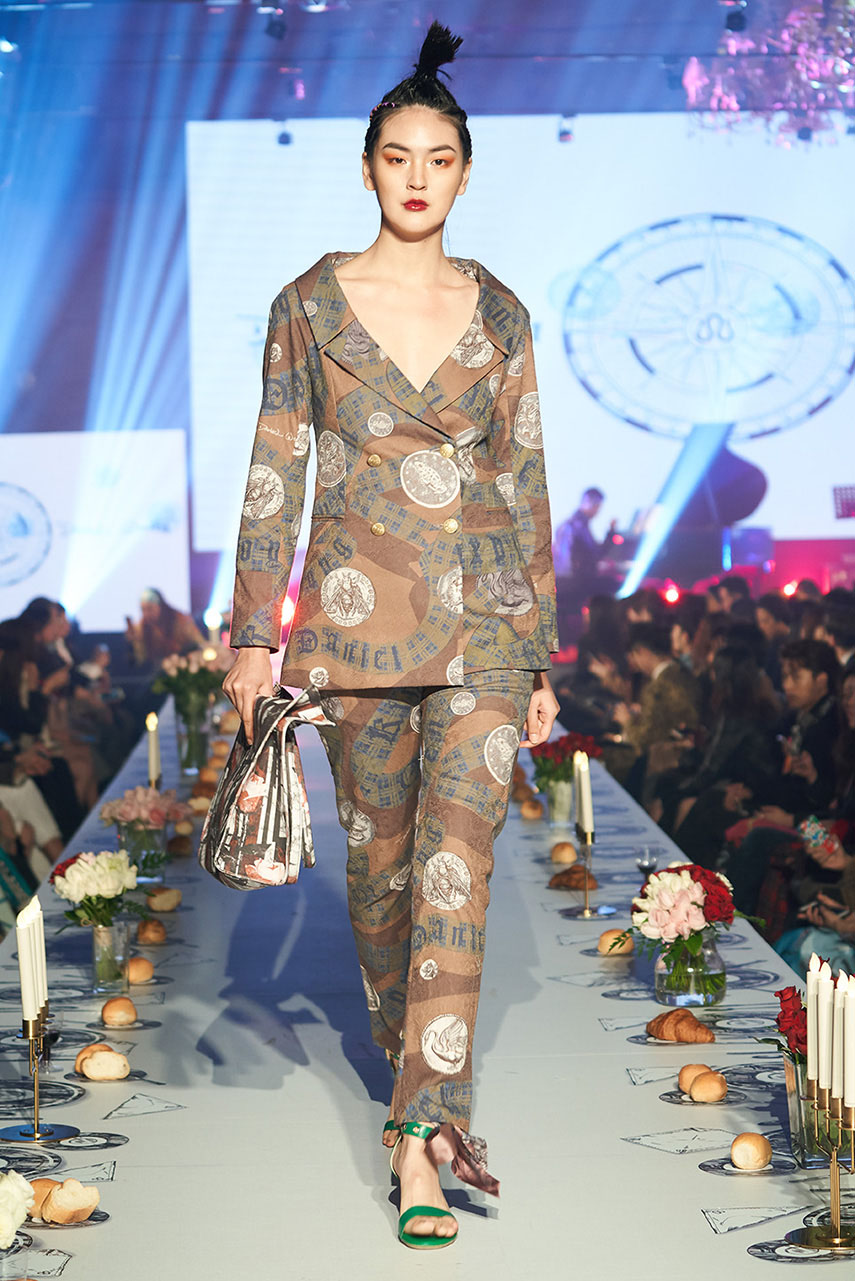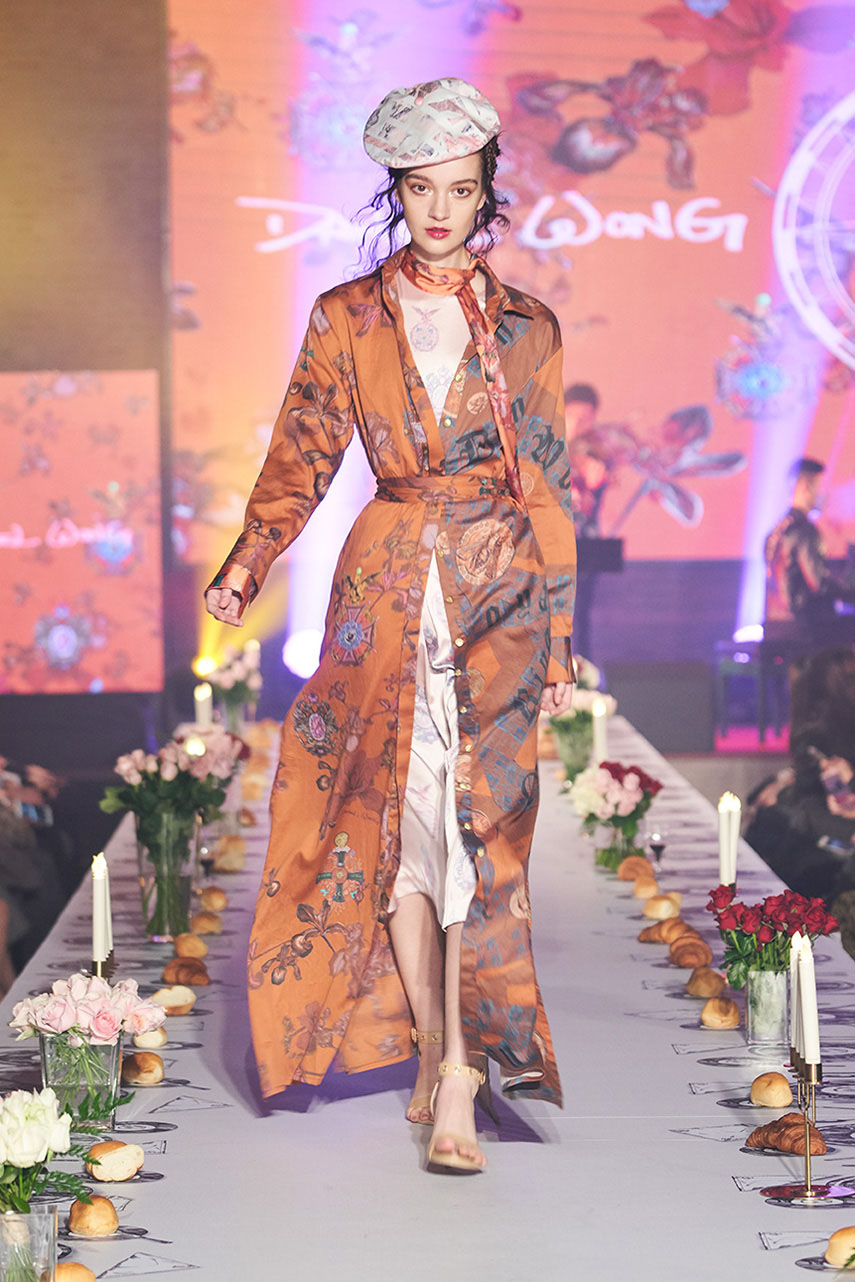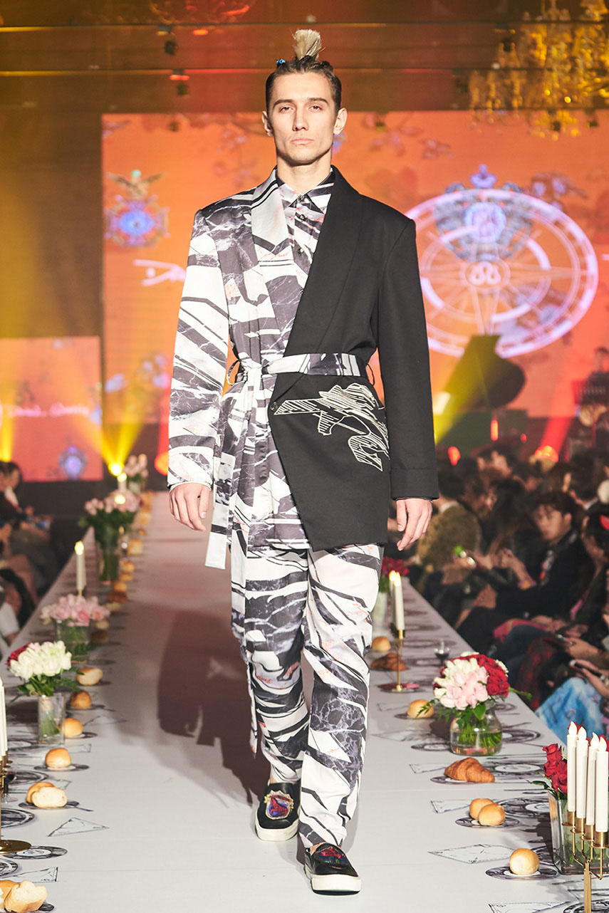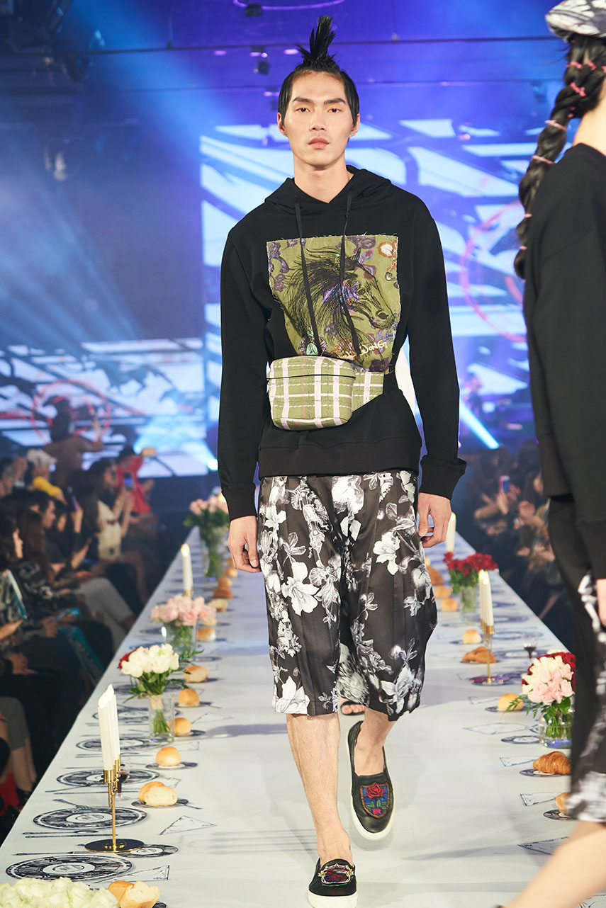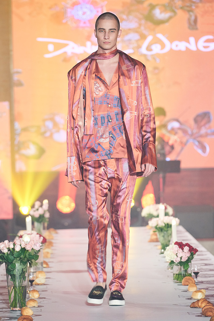 Daniel Wong 以童年在愛丁堡與倫敦的文化記憶為靈感,打造全新主題「愛丁堡狂想曲」,透過格紋、徽章、皇冠、鑽石與自然花卉印花等細節,混融學院紳士、龐克風、英倫文學與運動美學,展現多元層次的英倫風貌。大秀選址於1919藝文中心,將空間改造為充滿魔幻詭譎氛圍的英倫車站秀場,從暗紅燈光、水晶吊燈到長桌型伸展台,處處展現Daniel對敘事美學的巧思。本季更首度推出高跟鞋系列與滿版印花配件,壓軸由模特兒身穿印花蘇格蘭裙與品牌圖騰T恤謝幕,為這場文化混搭的奇幻旅程劃下最華麗的句點。