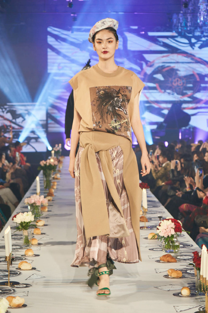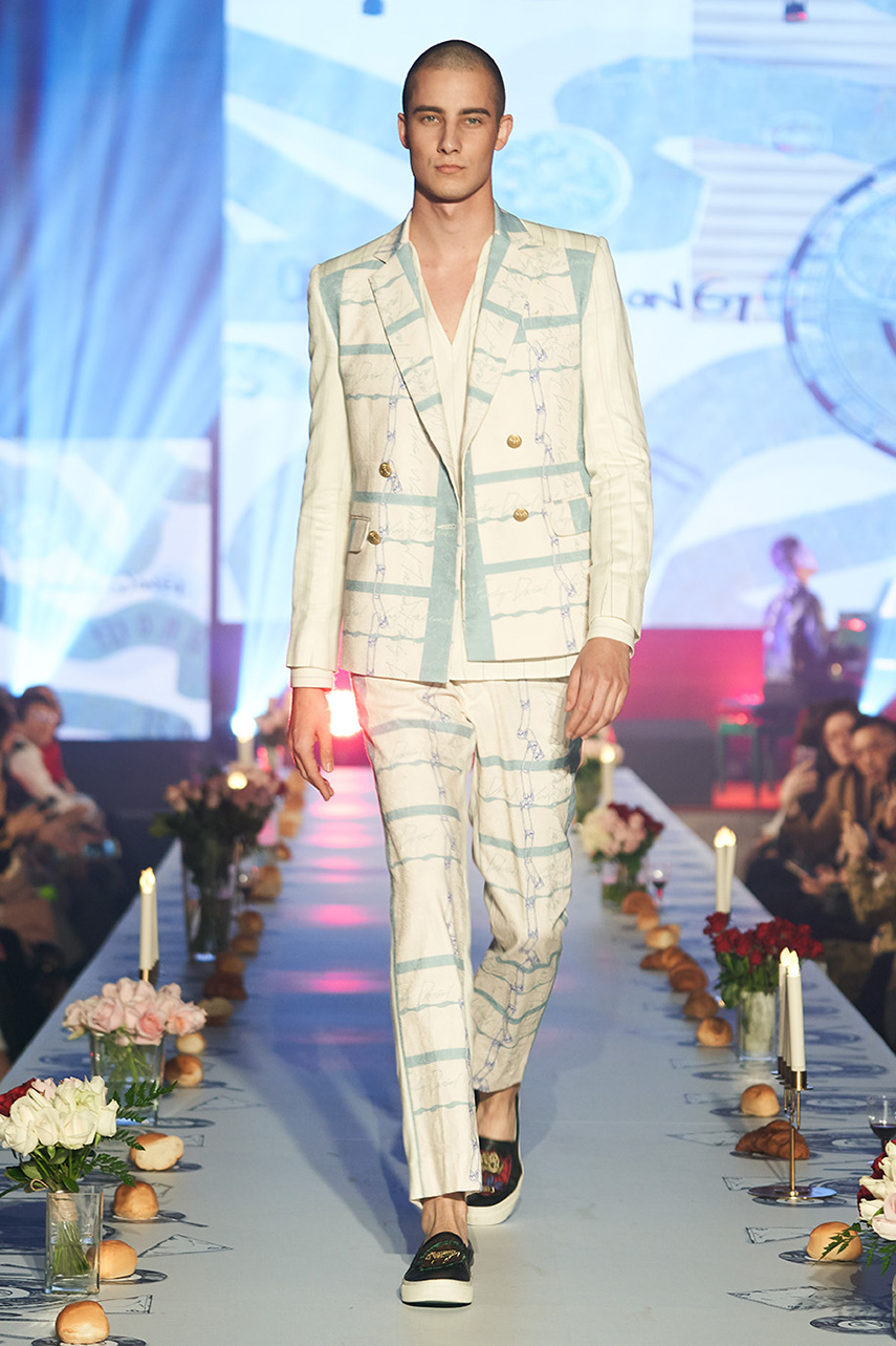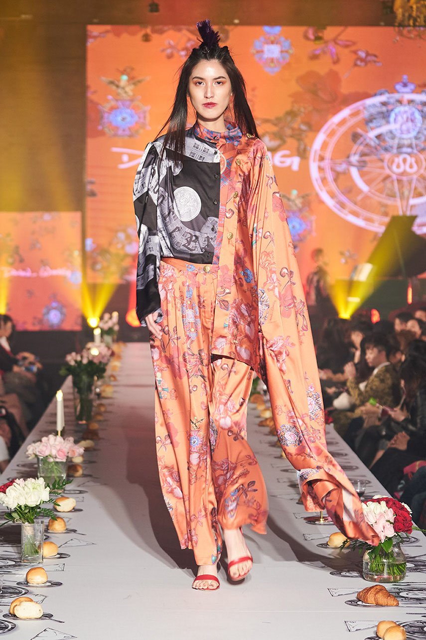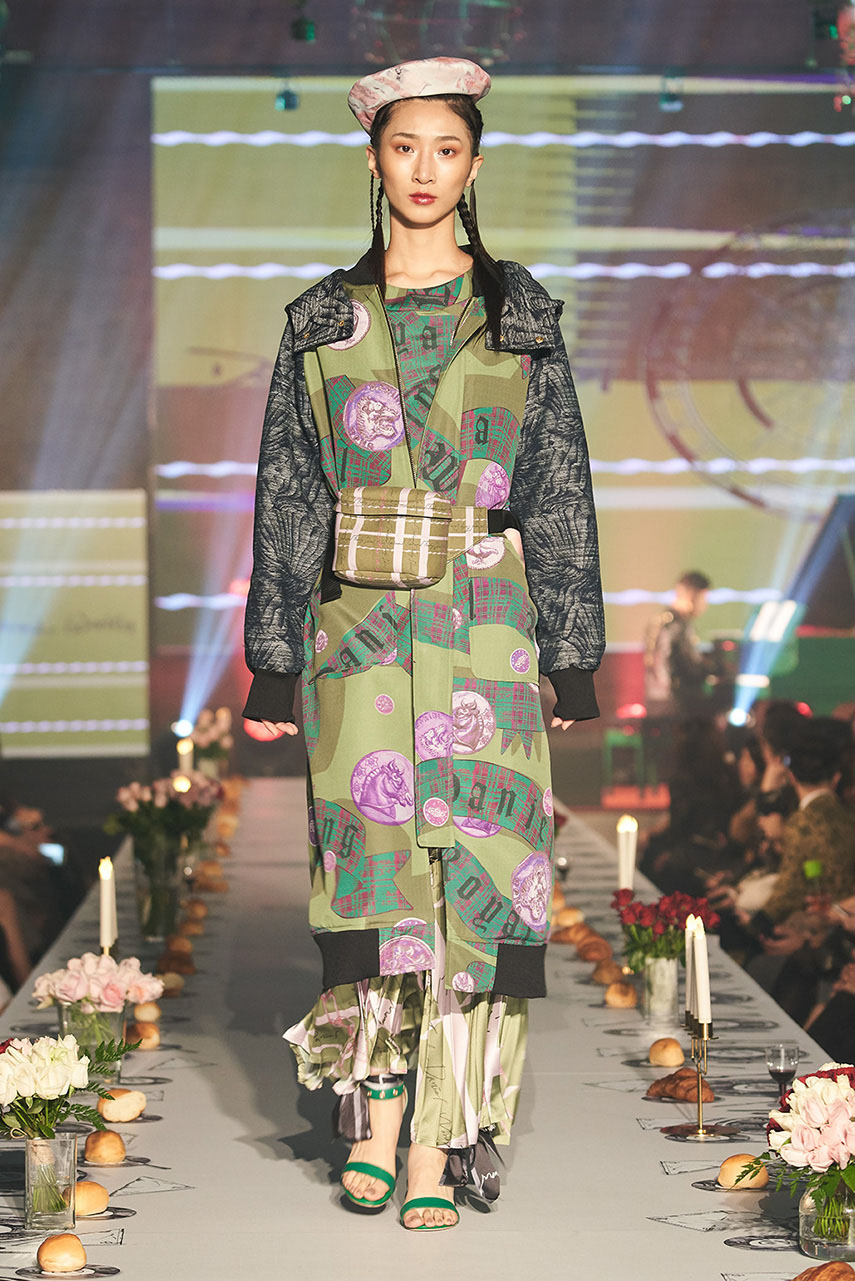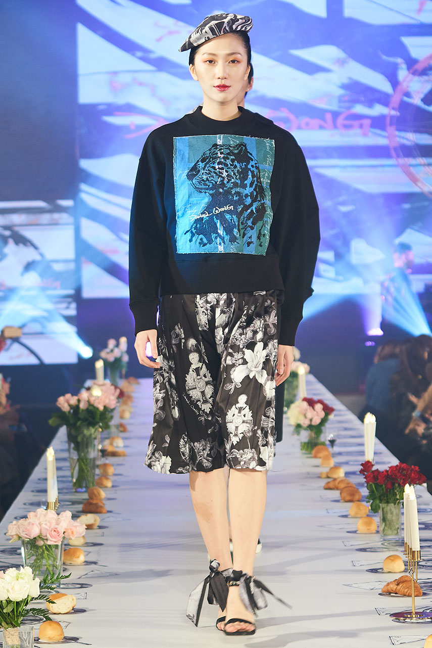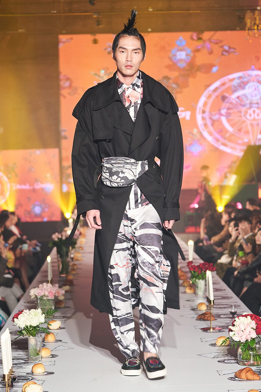Daniel Wong 以童年在愛丁堡與倫敦的文化記憶為靈感,打造全新主題「愛丁堡狂想曲」,透過格紋、徽章、皇冠、鑽石與自然花卉印花等細節,混融學院紳士、龐克風、英倫文學與運動美學,展現多元層次的英倫風貌。大秀選址於1919藝文中心,將空間改造為充滿魔幻詭譎氛圍的英倫車站秀場,從暗紅燈光、水晶吊燈到長桌型伸展台,處處展現Daniel對敘事美學的巧思。本季更首度推出高跟鞋系列與滿版印花配件,壓軸由模特兒身穿印花蘇格蘭裙與品牌圖騰T恤謝幕,為這場文化混搭的奇幻旅程劃下最華麗的句點。