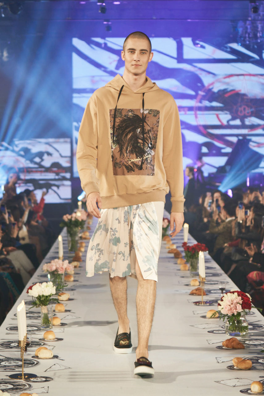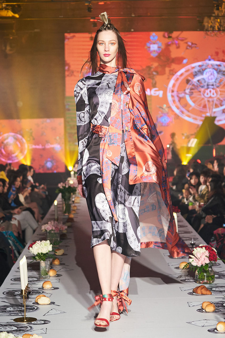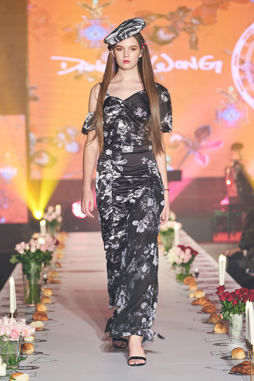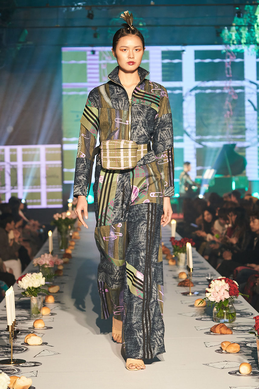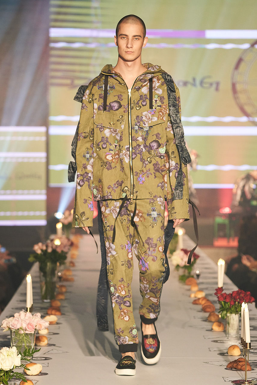 Daniel Wong 以童年在愛丁堡與倫敦的文化記憶為靈感,打造全新主題「愛丁堡狂想曲」,透過格紋、徽章、皇冠、鑽石與自然花卉印花等細節,混融學院紳士、龐克風、英倫文學與運動美學,展現多元層次的英倫風貌。大秀選址於1919藝文中心,將空間改造為充滿魔幻詭譎氛圍的英倫車站秀場,從暗紅燈光、水晶吊燈到長桌型伸展台,處處展現Daniel對敘事美學的巧思。本季更首度推出高跟鞋系列與滿版印花配件,壓軸由模特兒身穿印花蘇格蘭裙與品牌圖騰T恤謝幕,為這場文化混搭的奇幻旅程劃下最華麗的句點。