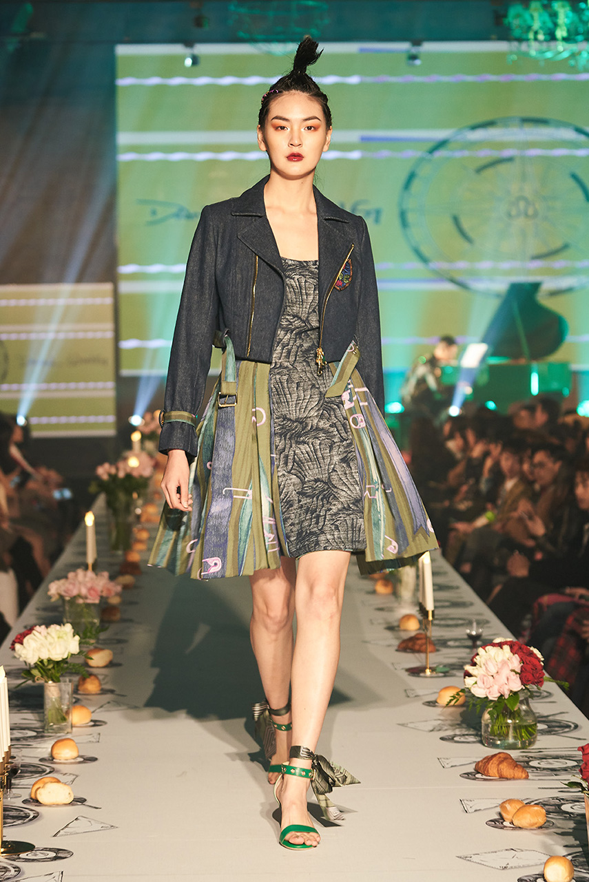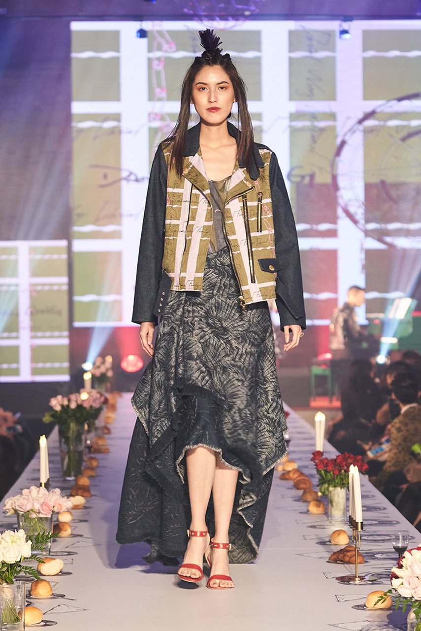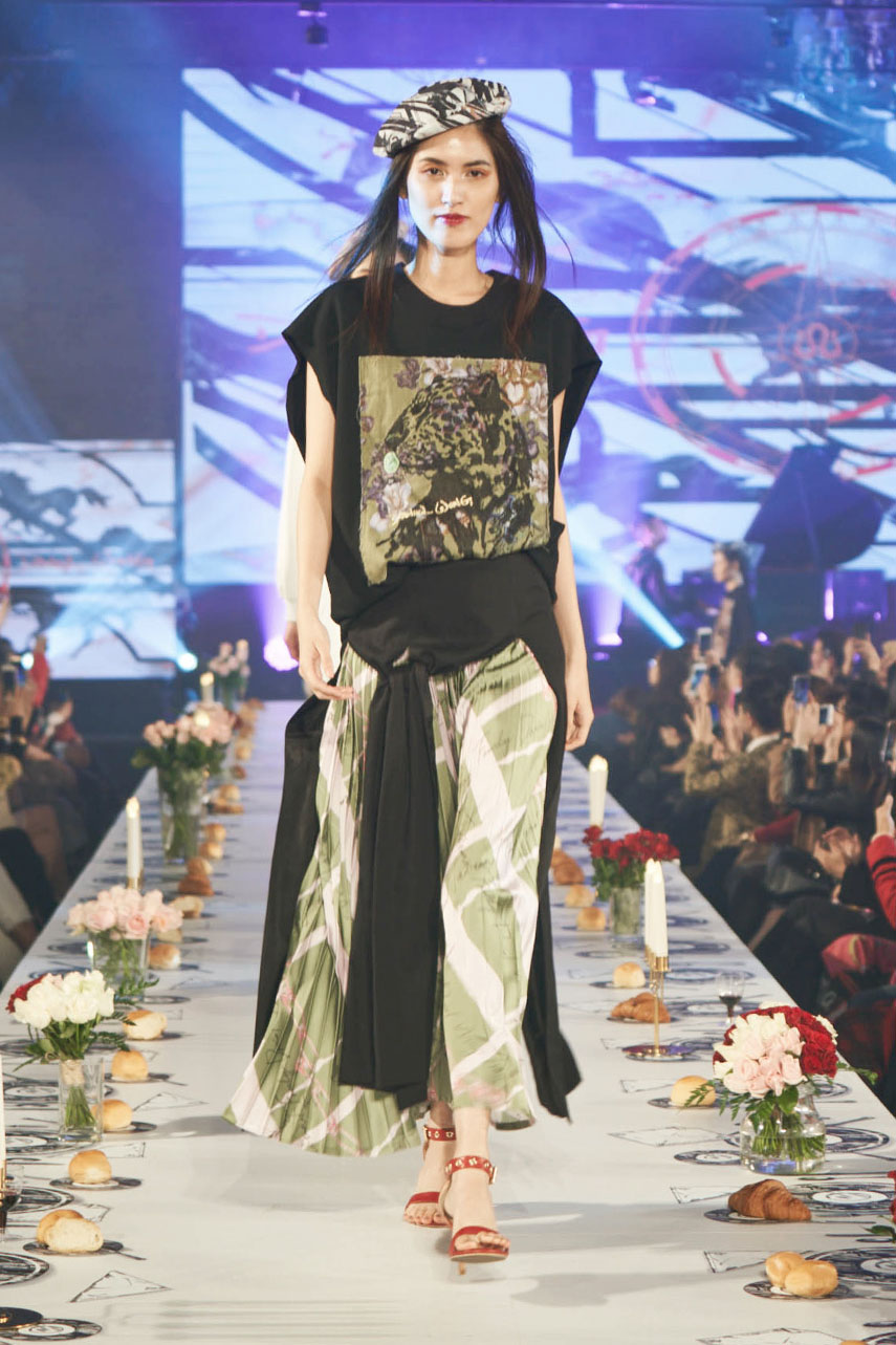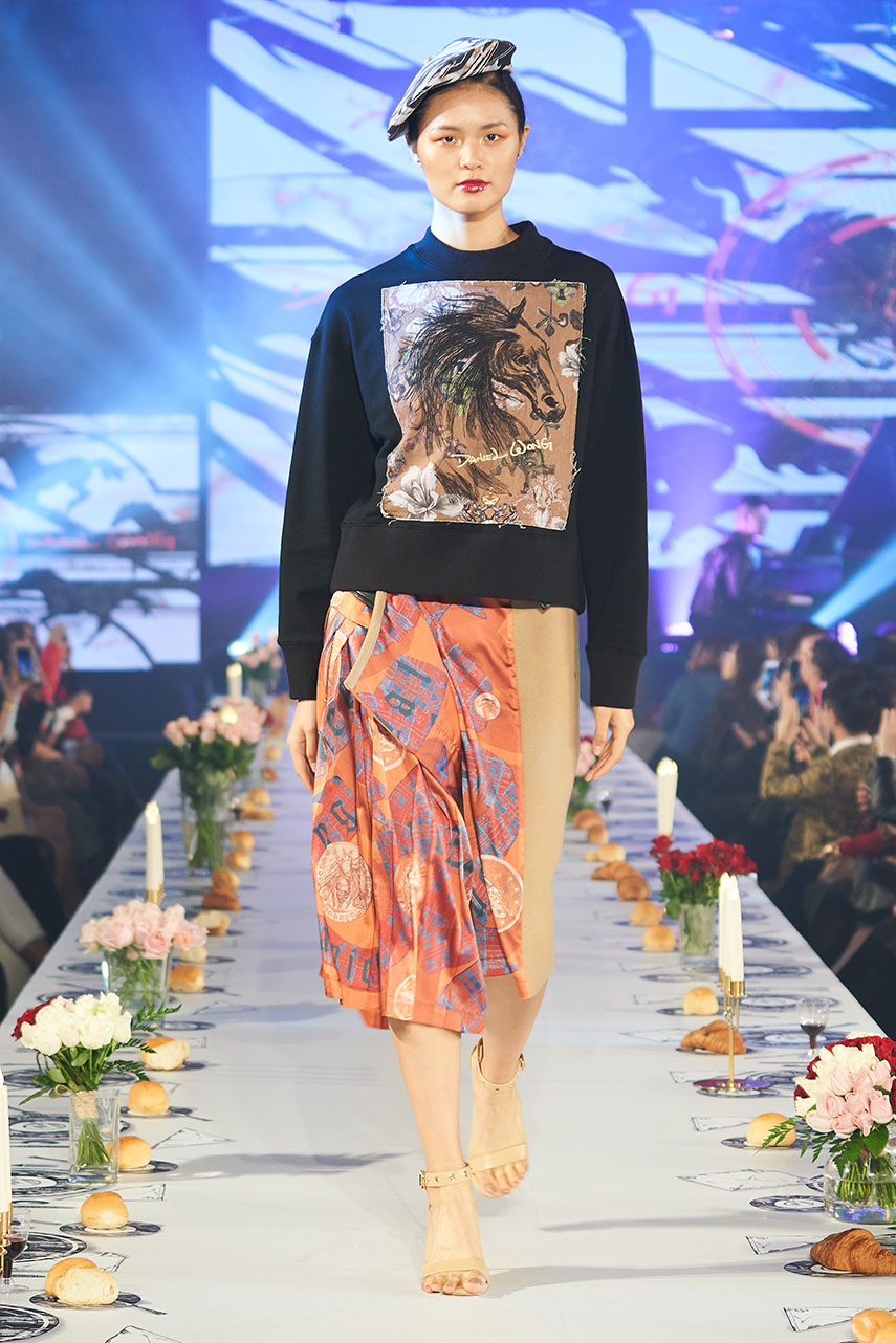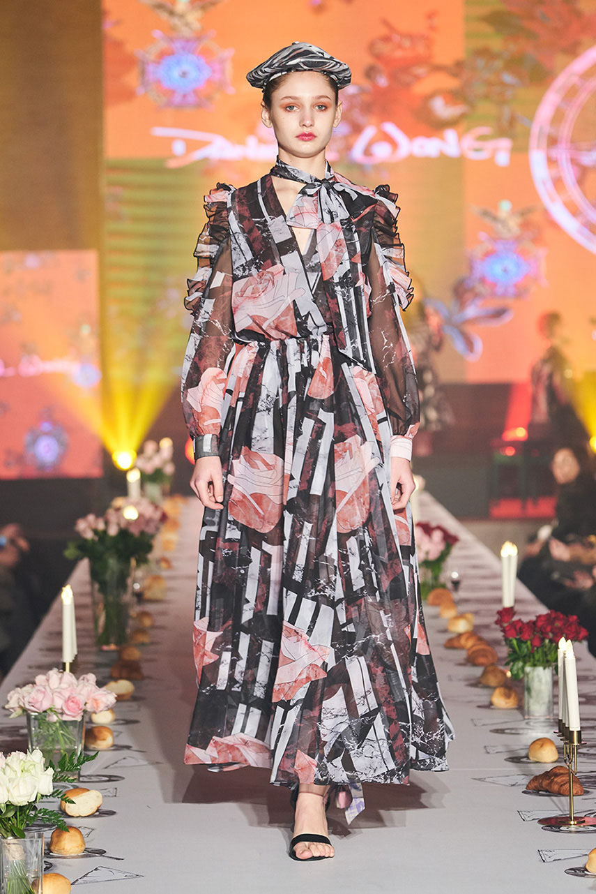 Daniel Wong 以童年在愛丁堡與倫敦的文化記憶為靈感,打造全新主題「愛丁堡狂想曲」,透過格紋、徽章、皇冠、鑽石與自然花卉印花等細節,混融學院紳士、龐克風、英倫文學與運動美學,展現多元層次的英倫風貌。大秀選址於1919藝文中心,將空間改造為充滿魔幻詭譎氛圍的英倫車站秀場,從暗紅燈光、水晶吊燈到長桌型伸展台,處處展現Daniel對敘事美學的巧思。本季更首度推出高跟鞋系列與滿版印花配件,壓軸由模特兒身穿印花蘇格蘭裙與品牌圖騰T恤謝幕,為這場文化混搭的奇幻旅程劃下最華麗的句點。