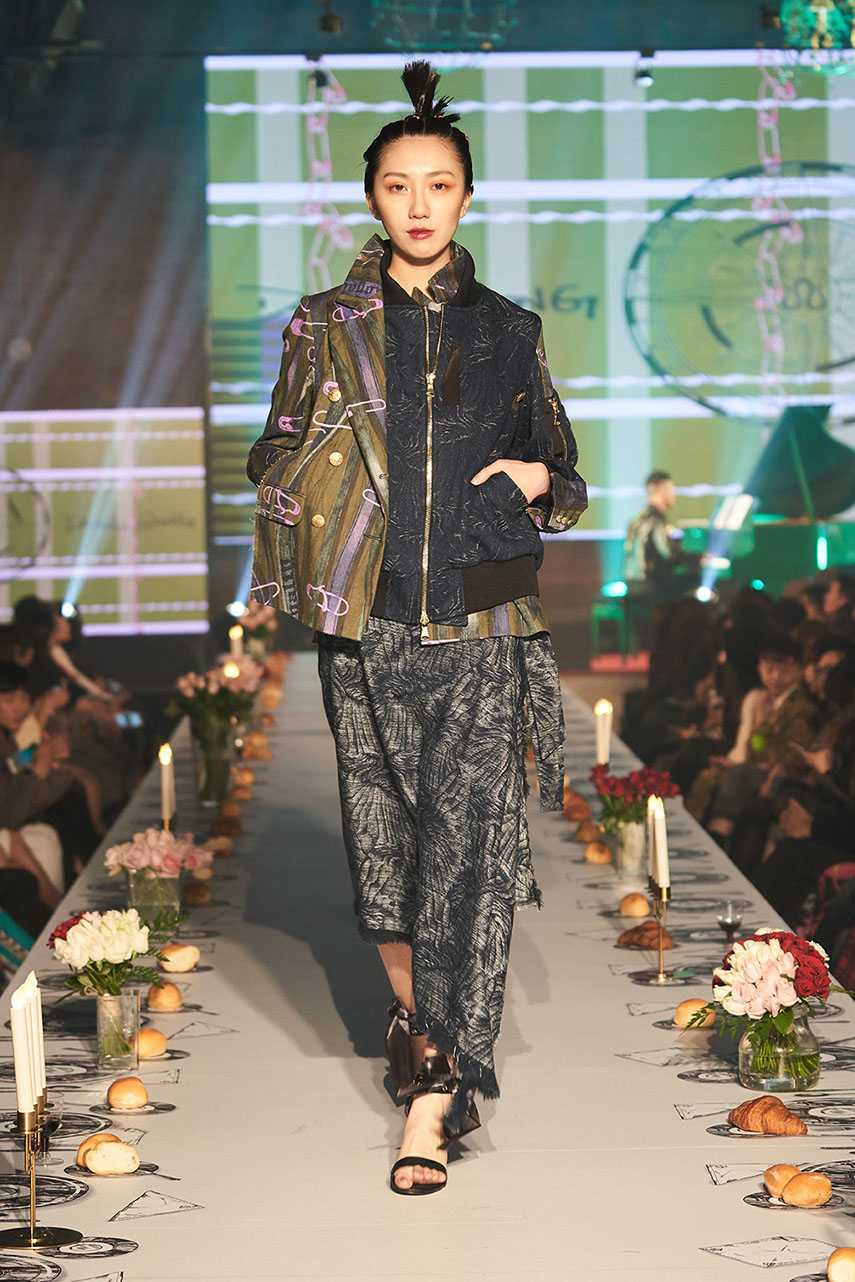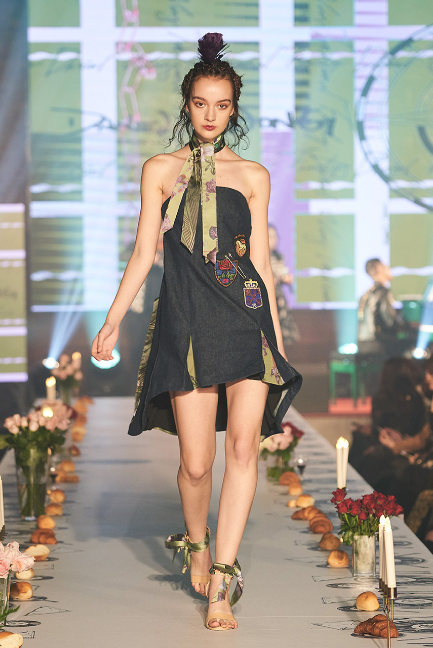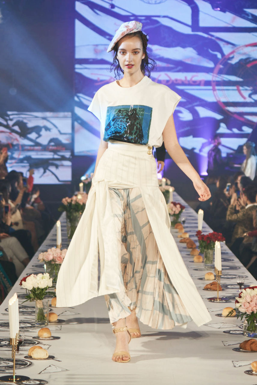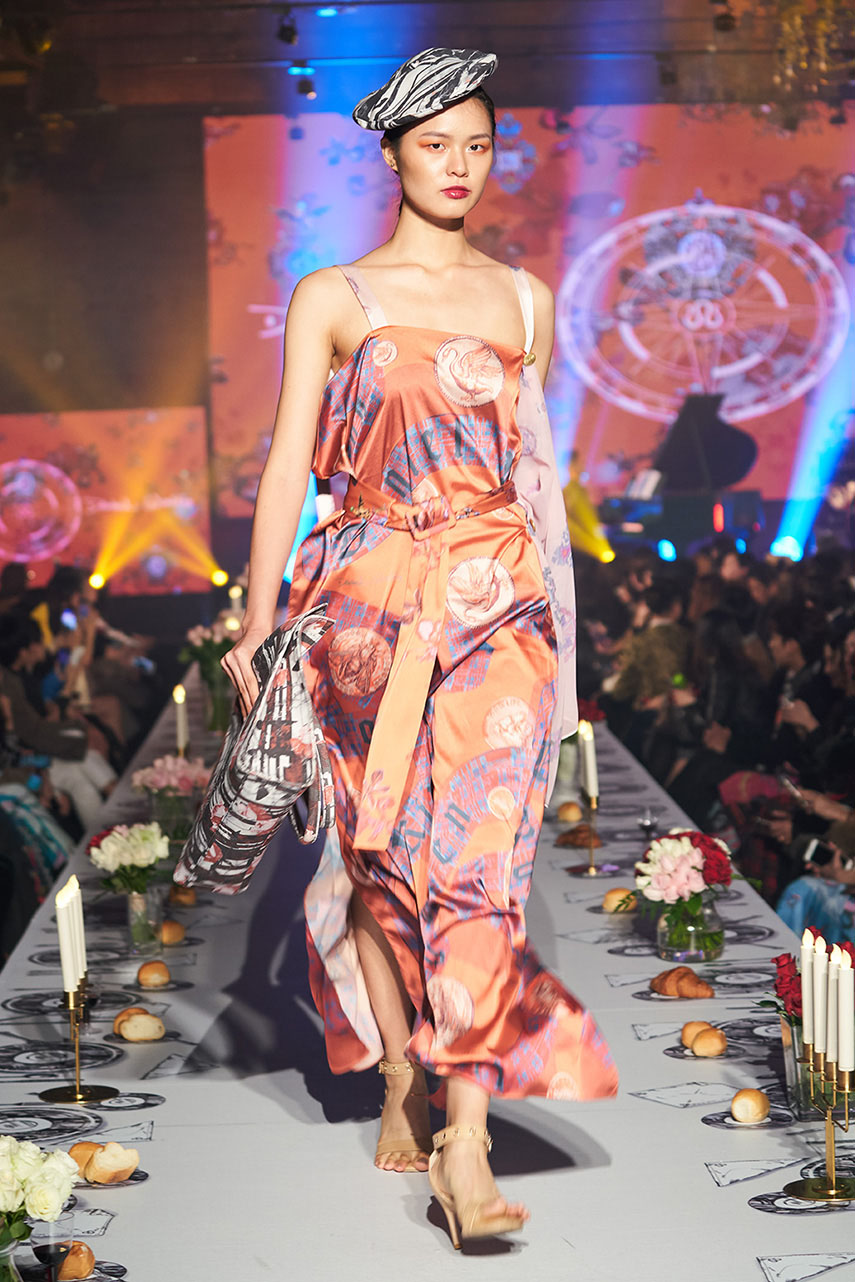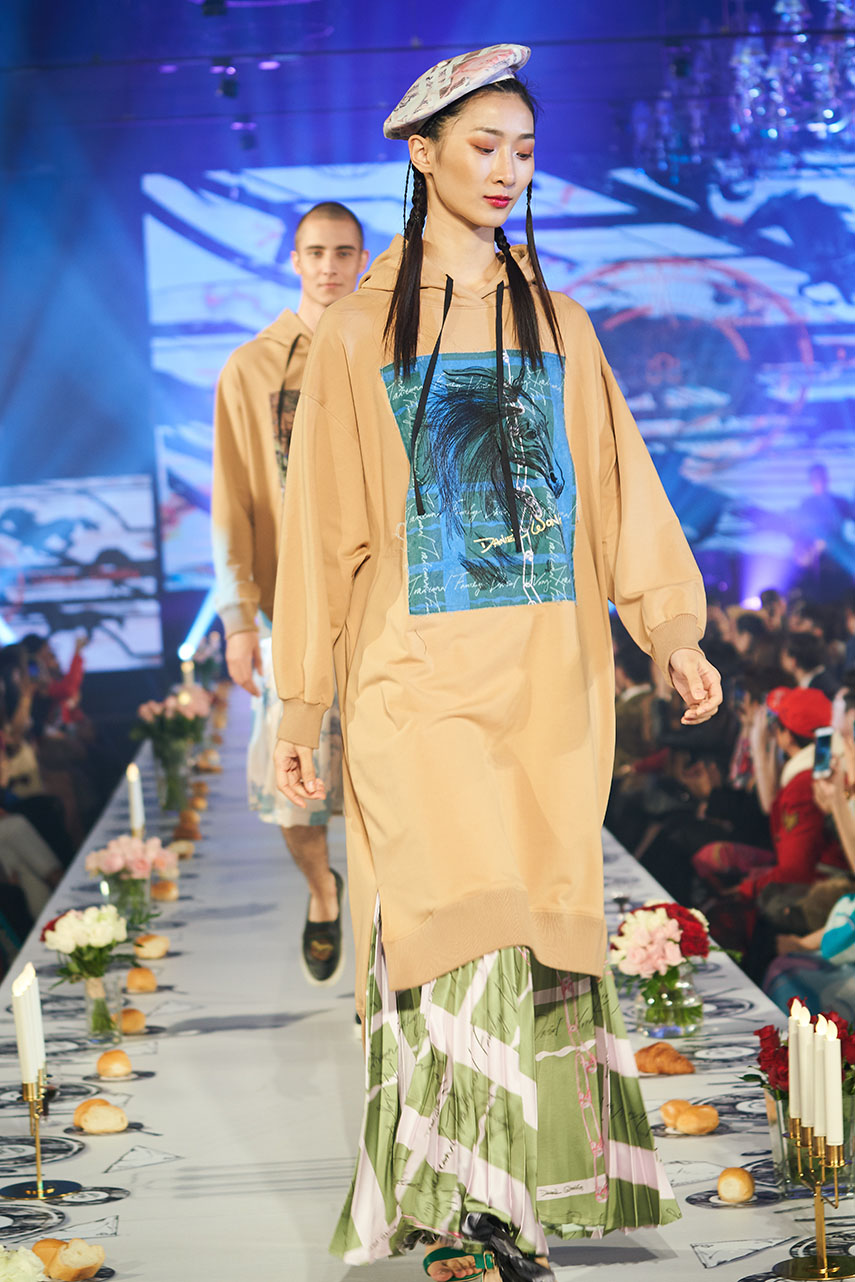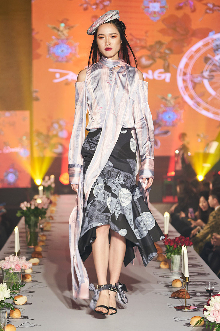 Daniel Wong 以童年在愛丁堡與倫敦的文化記憶為靈感,打造全新主題「愛丁堡狂想曲」,透過格紋、徽章、皇冠、鑽石與自然花卉印花等細節,混融學院紳士、龐克風、英倫文學與運動美學,展現多元層次的英倫風貌。大秀選址於1919藝文中心,將空間改造為充滿魔幻詭譎氛圍的英倫車站秀場,從暗紅燈光、水晶吊燈到長桌型伸展台,處處展現Daniel對敘事美學的巧思。本季更首度推出高跟鞋系列與滿版印花配件,壓軸由模特兒身穿印花蘇格蘭裙與品牌圖騰T恤謝幕,為這場文化混搭的奇幻旅程劃下最華麗的句點。