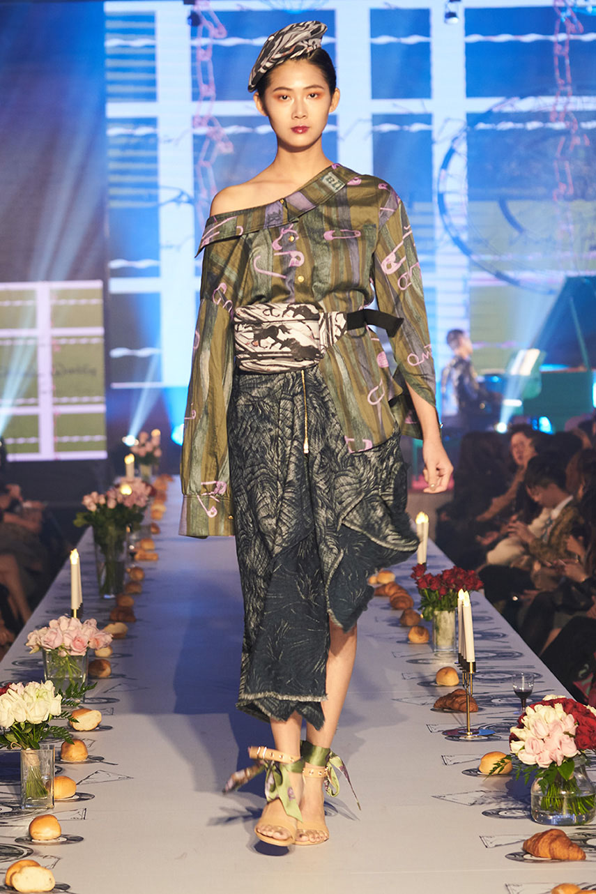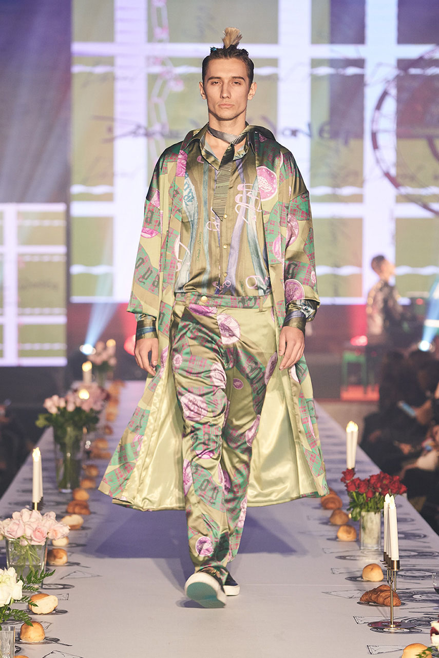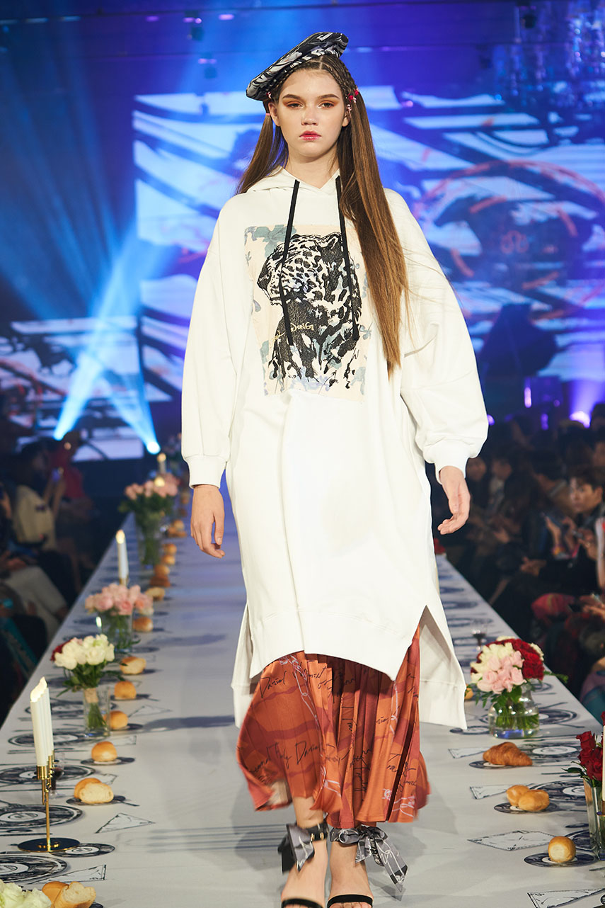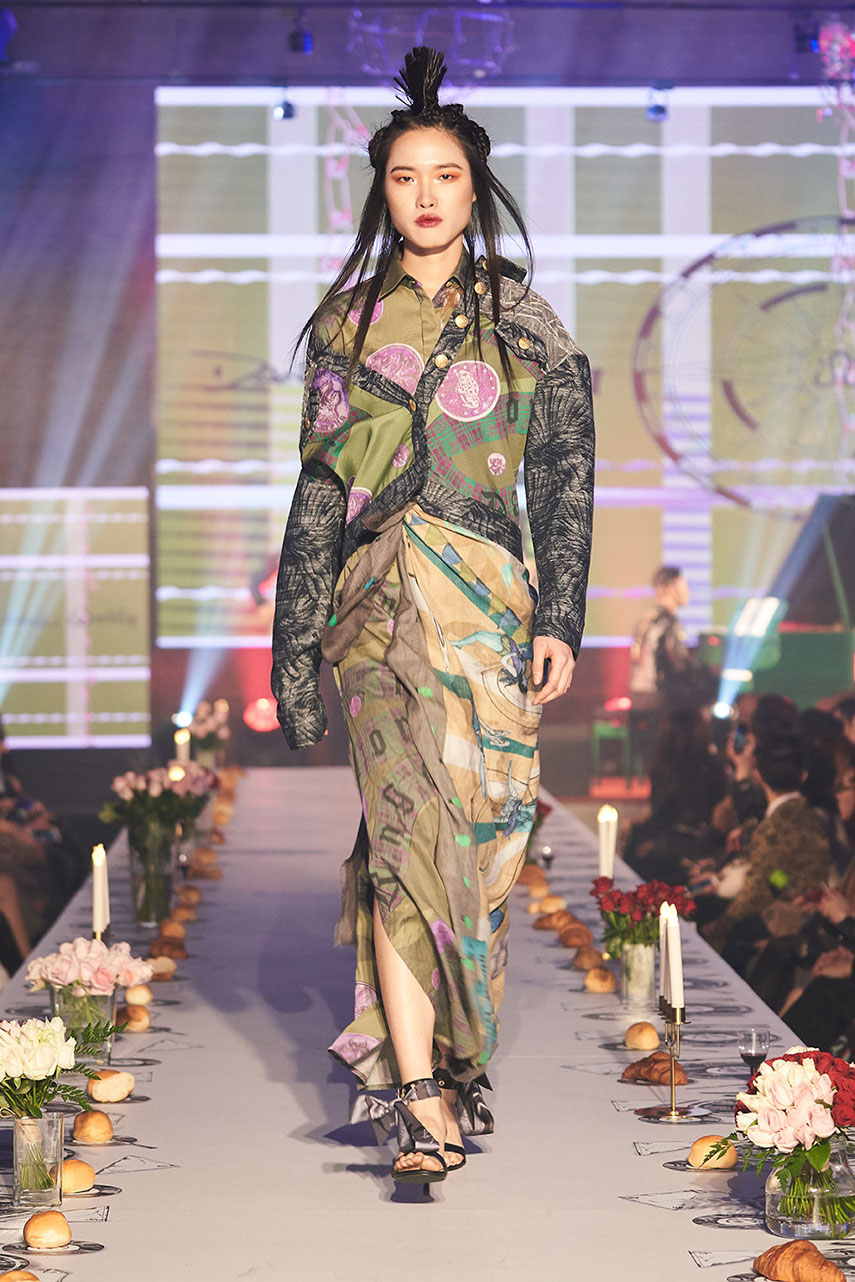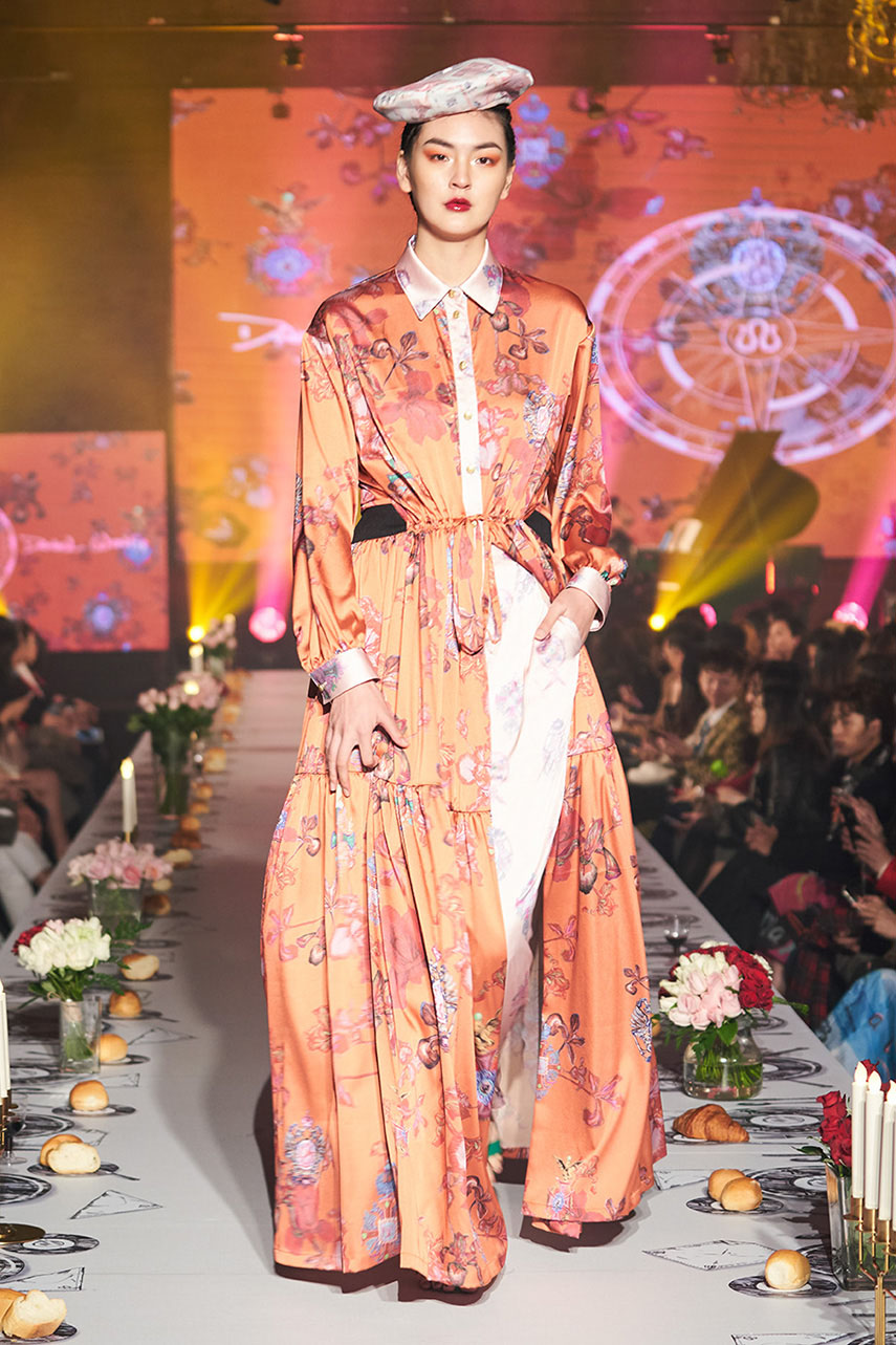 Daniel Wong 以童年在愛丁堡與倫敦的文化記憶為靈感,打造全新主題「愛丁堡狂想曲」,透過格紋、徽章、皇冠、鑽石與自然花卉印花等細節,混融學院紳士、龐克風、英倫文學與運動美學,展現多元層次的英倫風貌。大秀選址於1919藝文中心,將空間改造為充滿魔幻詭譎氛圍的英倫車站秀場,從暗紅燈光、水晶吊燈到長桌型伸展台,處處展現Daniel對敘事美學的巧思。本季更首度推出高跟鞋系列與滿版印花配件,壓軸由模特兒身穿印花蘇格蘭裙與品牌圖騰T恤謝幕,為這場文化混搭的奇幻旅程劃下最華麗的句點。
