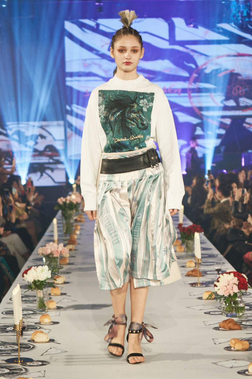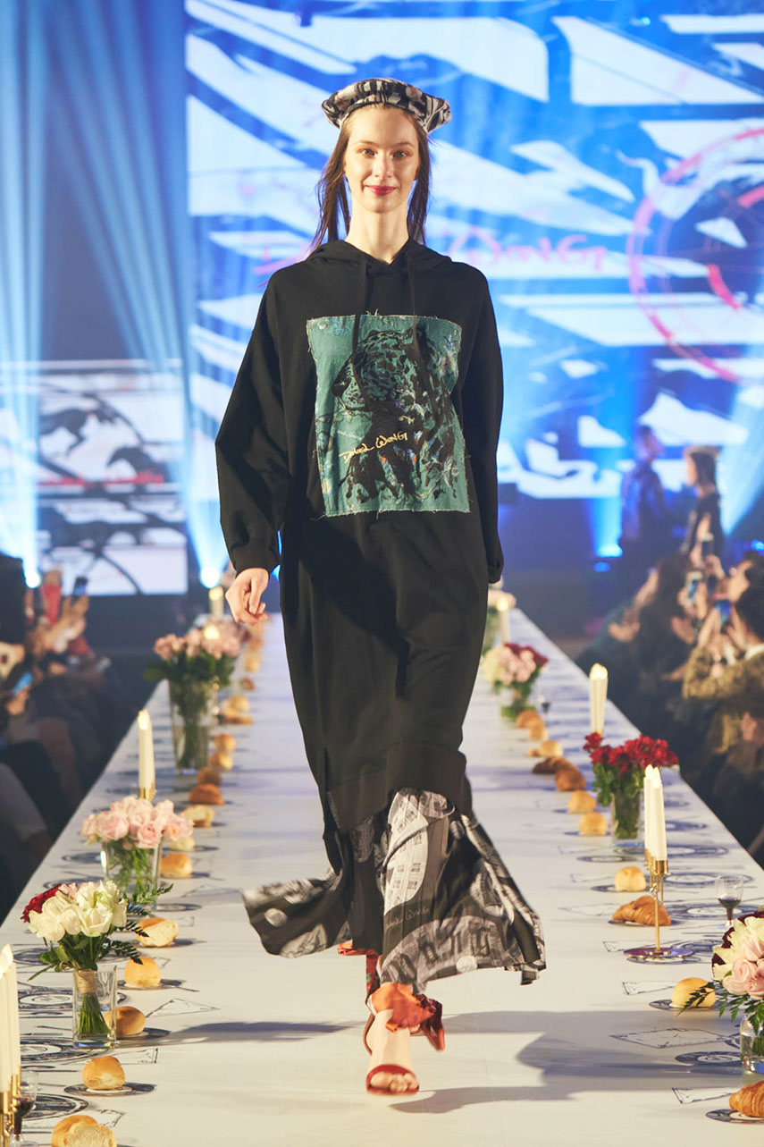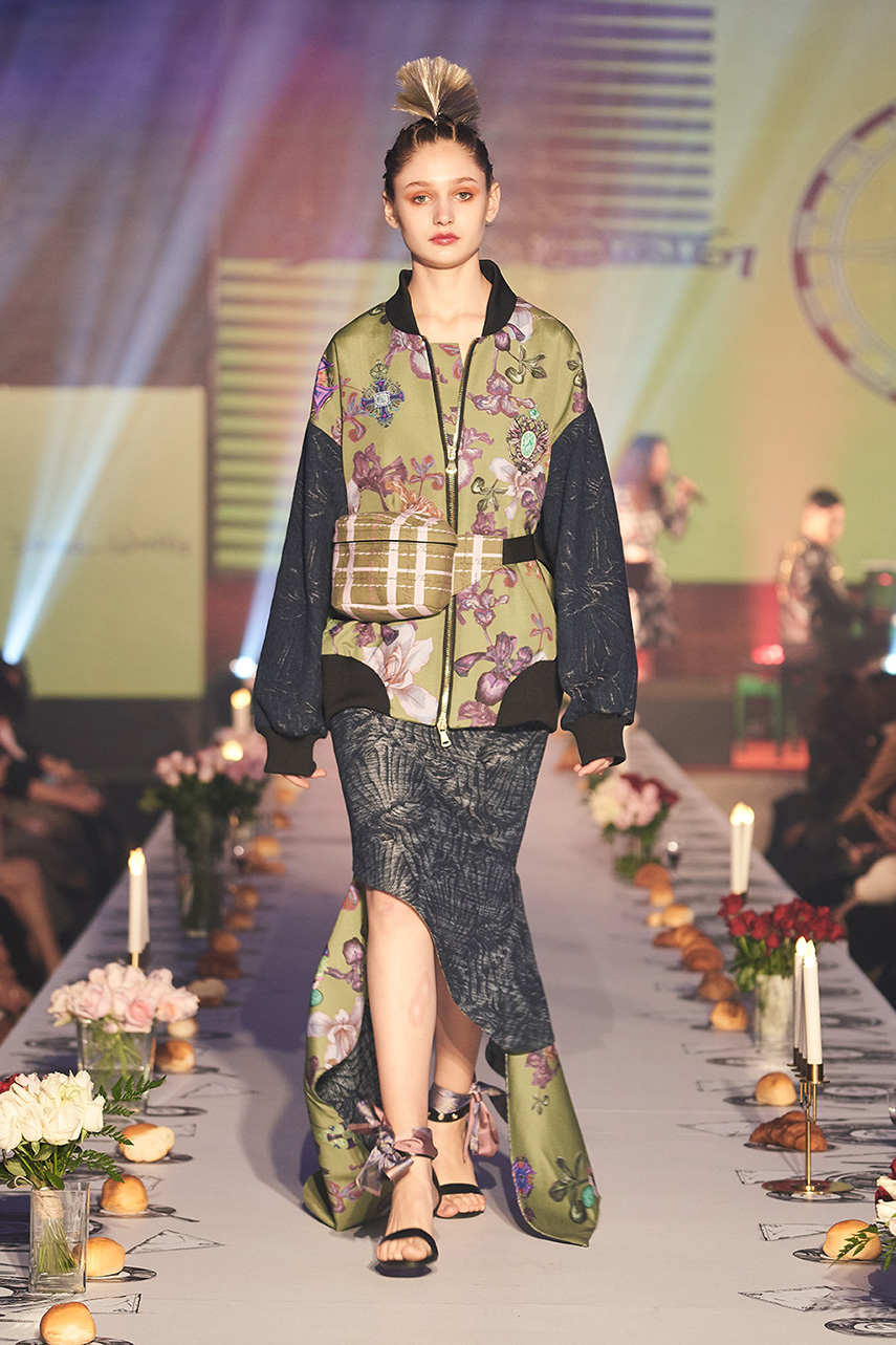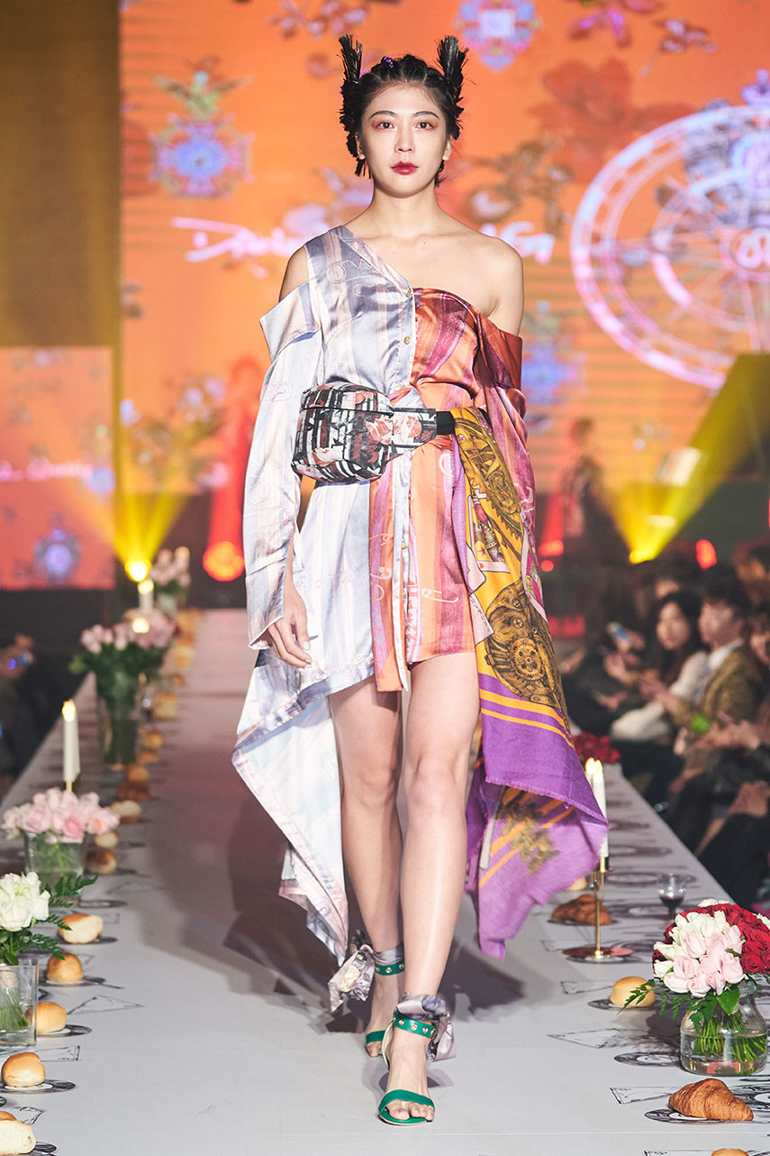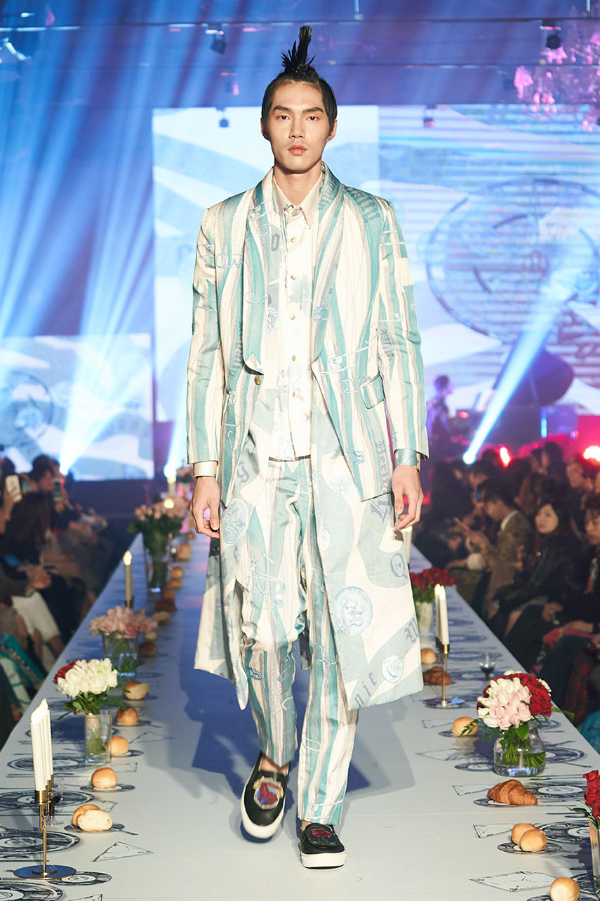 Daniel Wong 以童年在愛丁堡與倫敦的文化記憶為靈感,打造全新主題「愛丁堡狂想曲」,透過格紋、徽章、皇冠、鑽石與自然花卉印花等細節,混融學院紳士、龐克風、英倫文學與運動美學,展現多元層次的英倫風貌。大秀選址於1919藝文中心,將空間改造為充滿魔幻詭譎氛圍的英倫車站秀場,從暗紅燈光、水晶吊燈到長桌型伸展台,處處展現Daniel對敘事美學的巧思。本季更首度推出高跟鞋系列與滿版印花配件,壓軸由模特兒身穿印花蘇格蘭裙與品牌圖騰T恤謝幕,為這場文化混搭的奇幻旅程劃下最華麗的句點。