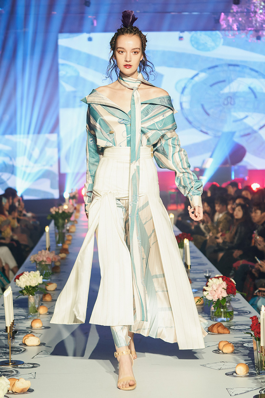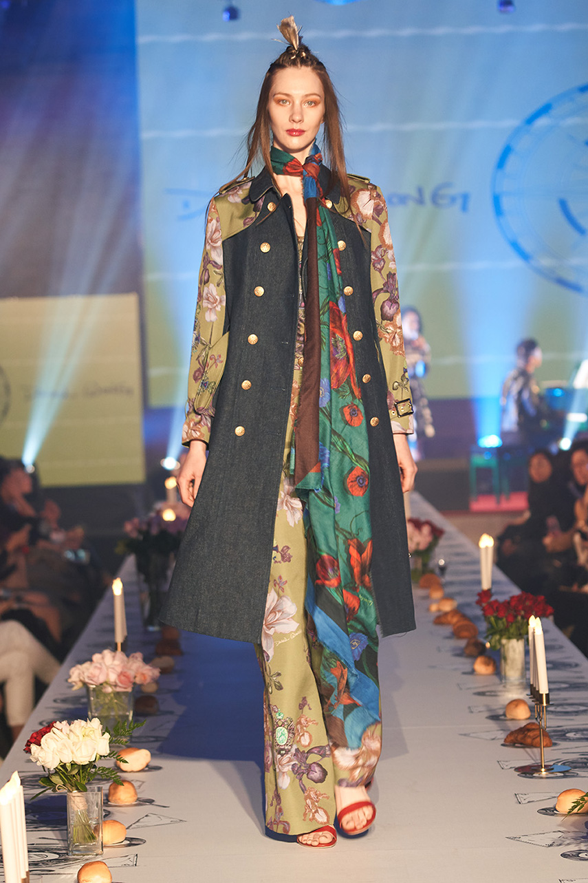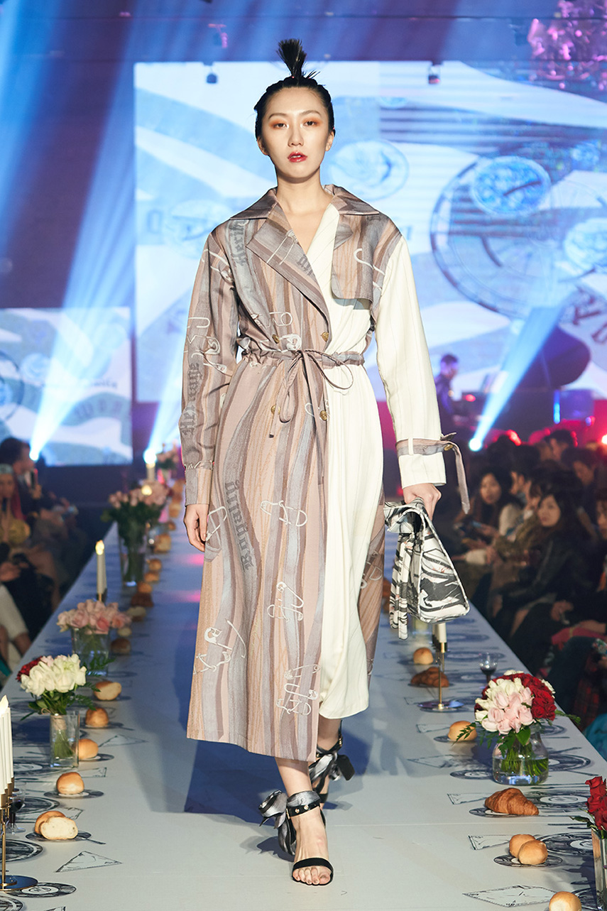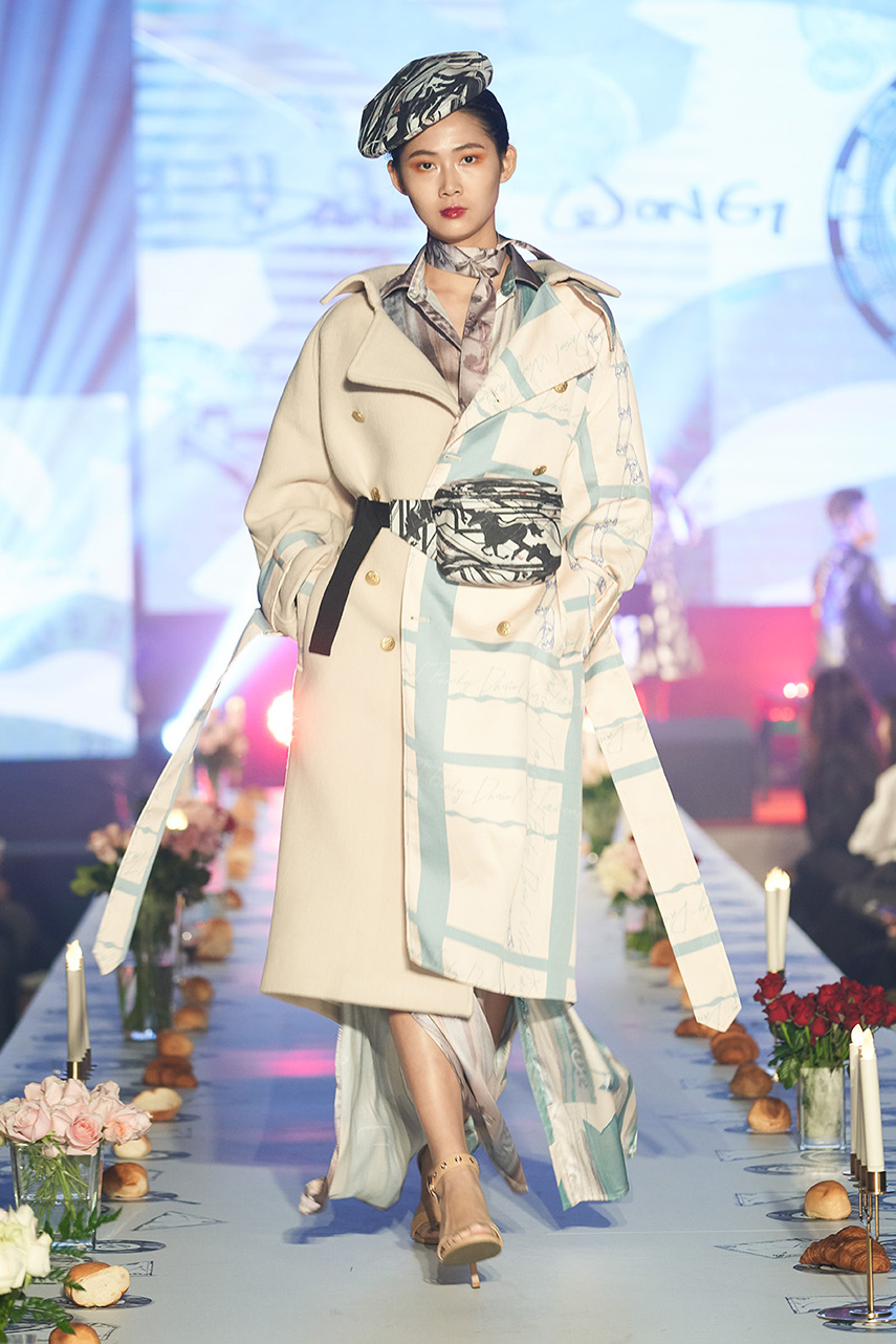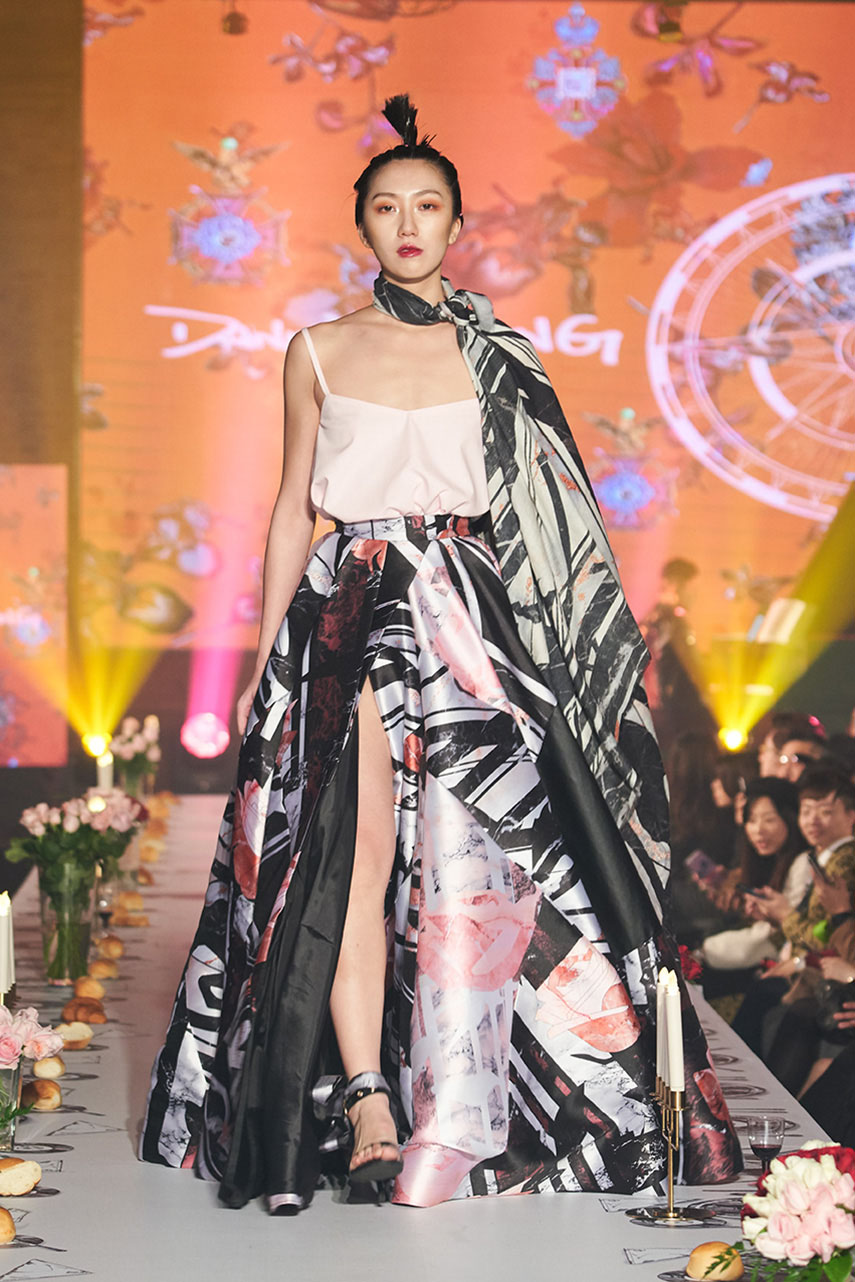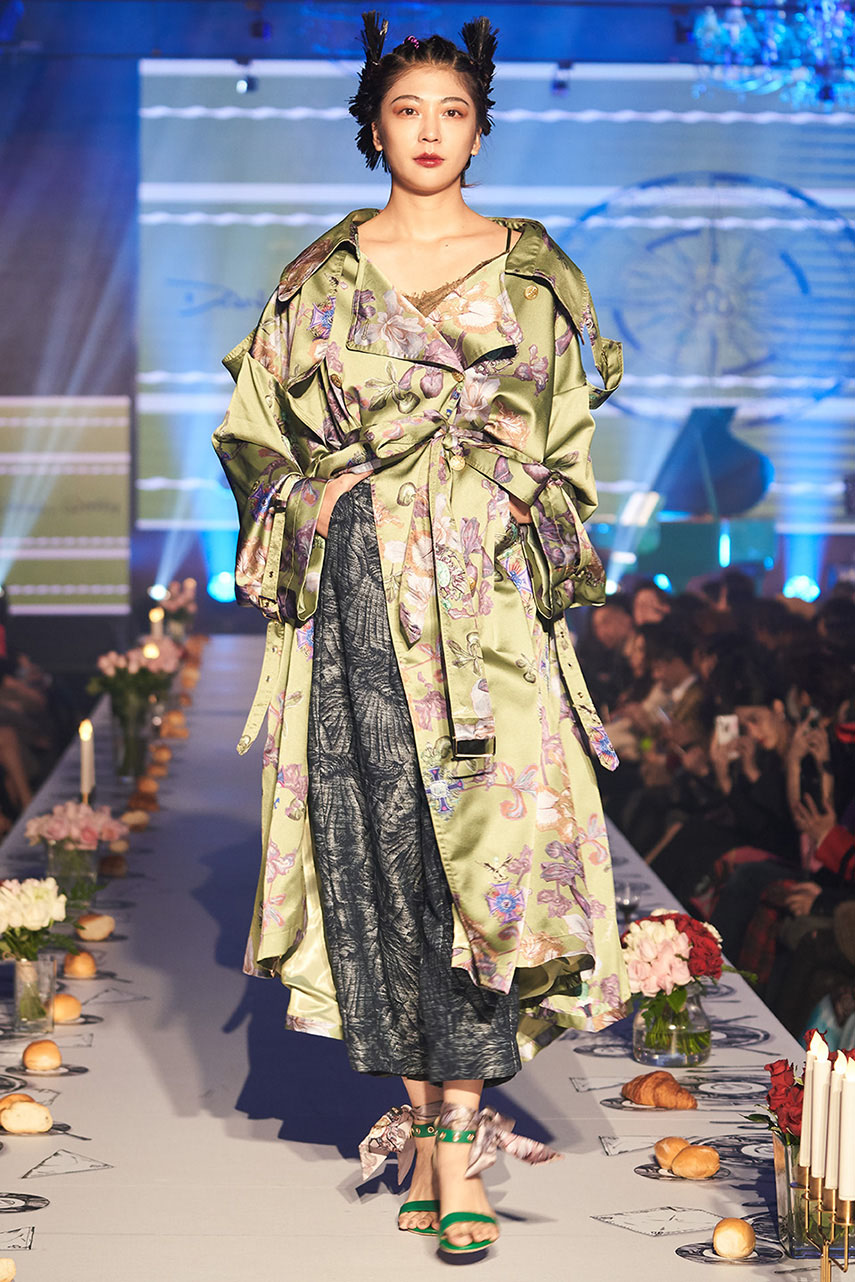 Daniel Wong 以童年在愛丁堡與倫敦的文化記憶為靈感,打造全新主題「愛丁堡狂想曲」,透過格紋、徽章、皇冠、鑽石與自然花卉印花等細節,混融學院紳士、龐克風、英倫文學與運動美學,展現多元層次的英倫風貌。大秀選址於1919藝文中心,將空間改造為充滿魔幻詭譎氛圍的英倫車站秀場,從暗紅燈光、水晶吊燈到長桌型伸展台,處處展現Daniel對敘事美學的巧思。本季更首度推出高跟鞋系列與滿版印花配件,壓軸由模特兒身穿印花蘇格蘭裙與品牌圖騰T恤謝幕,為這場文化混搭的奇幻旅程劃下最華麗的句點。