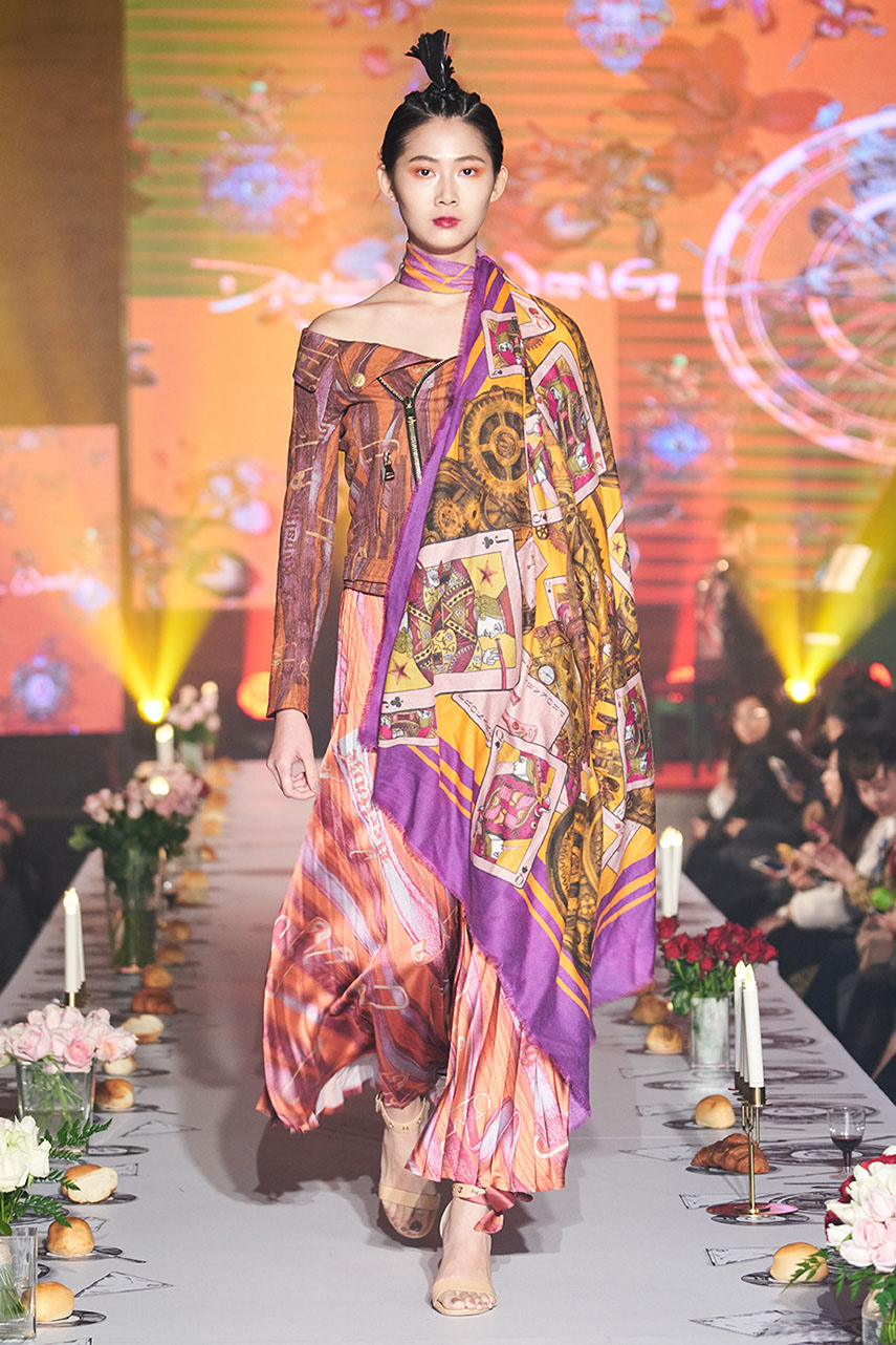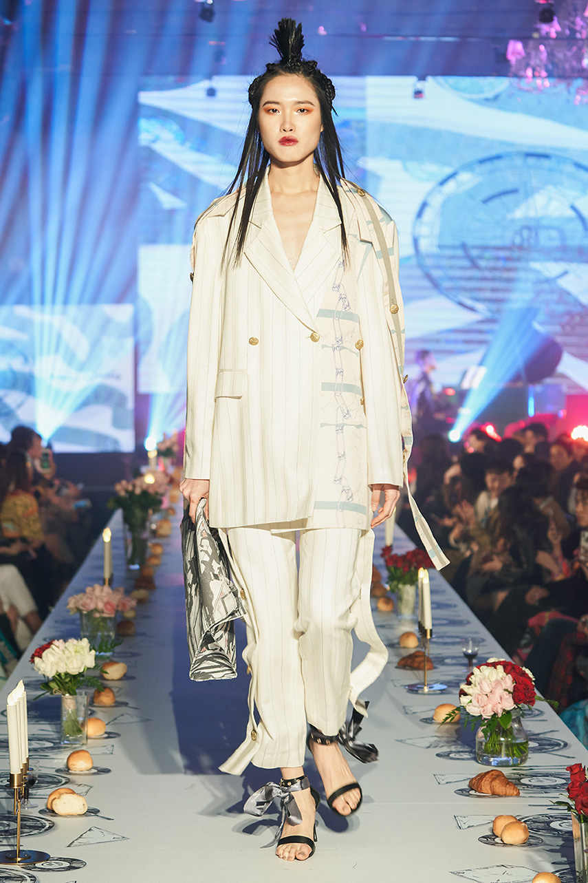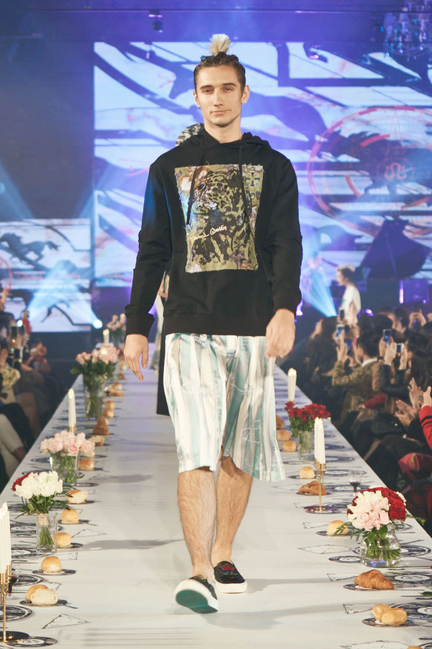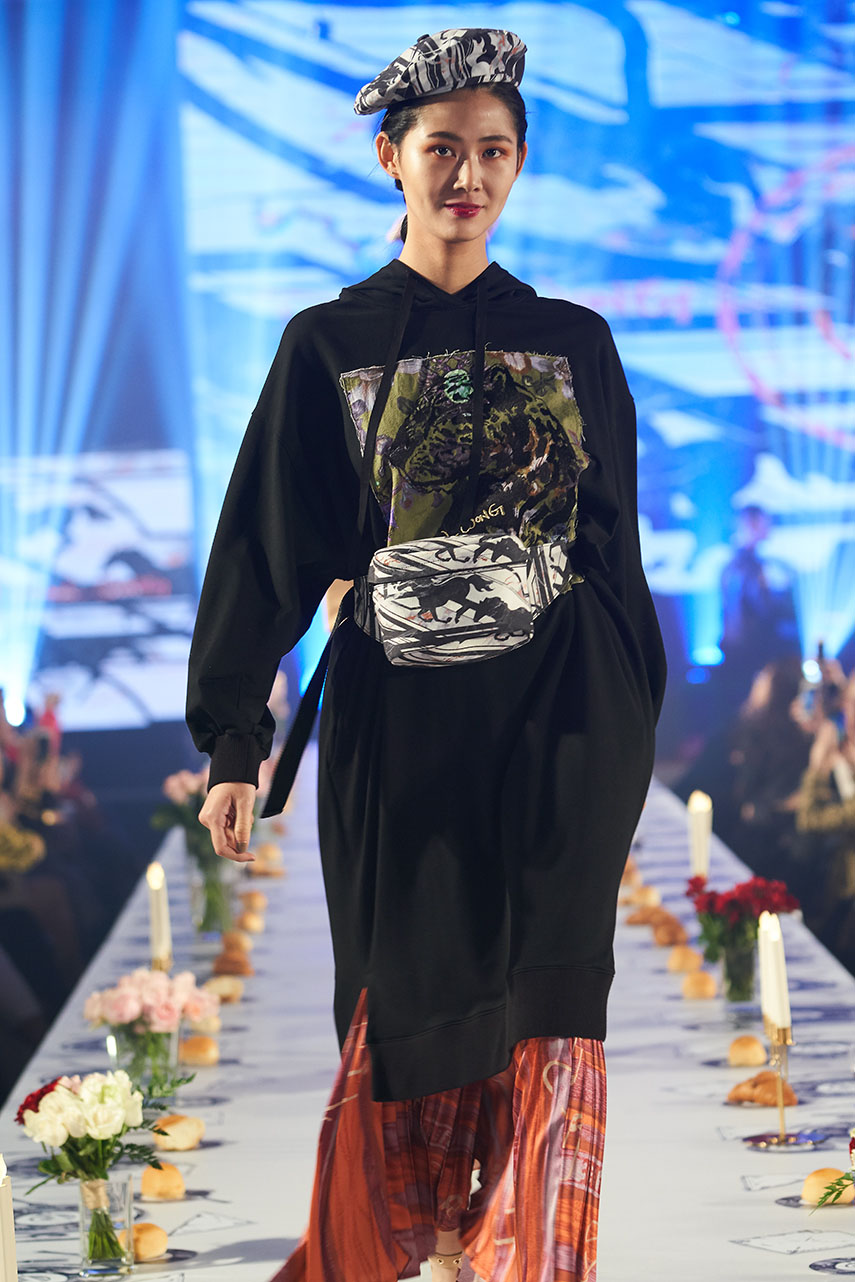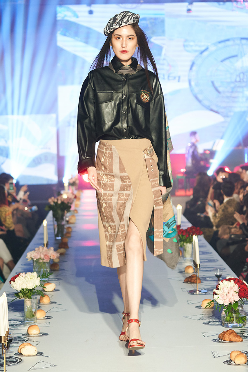 Daniel Wong 以童年在愛丁堡與倫敦的文化記憶為靈感,打造全新主題「愛丁堡狂想曲」,透過格紋、徽章、皇冠、鑽石與自然花卉印花等細節,混融學院紳士、龐克風、英倫文學與運動美學,展現多元層次的英倫風貌。大秀選址於1919藝文中心,將空間改造為充滿魔幻詭譎氛圍的英倫車站秀場,從暗紅燈光、水晶吊燈到長桌型伸展台,處處展現Daniel對敘事美學的巧思。本季更首度推出高跟鞋系列與滿版印花配件,壓軸由模特兒身穿印花蘇格蘭裙與品牌圖騰T恤謝幕,為這場文化混搭的奇幻旅程劃下最華麗的句點。